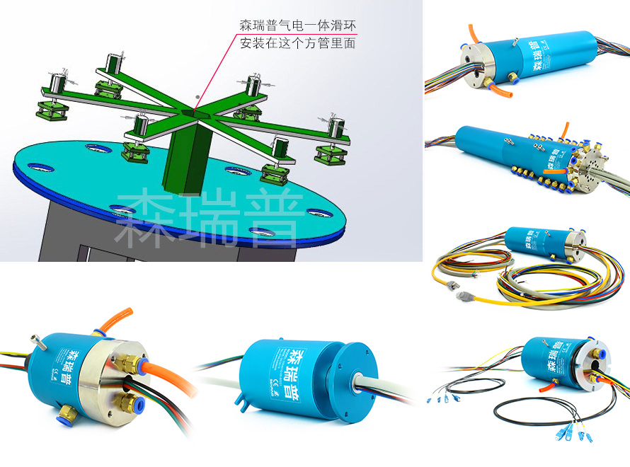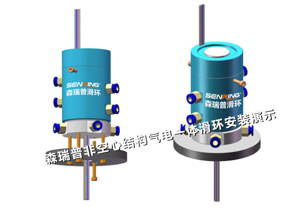 至于氣滑環(huán)、電滑環(huán)、氣電一體滑環(huán)工作原理,前兩種分別是用來360度旋轉(zhuǎn)傳輸氣體(包括各種液體)、電流,而氣電一體是將氣滑環(huán)和導(dǎo)電滑環(huán)合二為一。根據(jù)客戶的設(shè)計,他需要將森瑞普氣電一體旋轉(zhuǎn)接頭安裝在圓盤下面的方管內(nèi),下面這種安裝方式非常適合他。