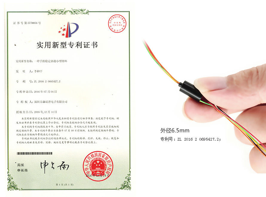 - 繼之前森瑞普研發(fā)外徑8.5mmSNM008系列穩(wěn)定器滑環(huán),森瑞普又成功研發(fā)外徑6.5mm電子云臺手持穩(wěn)定器用的微型滑環(huán),并獲得國家發(fā)明專利。