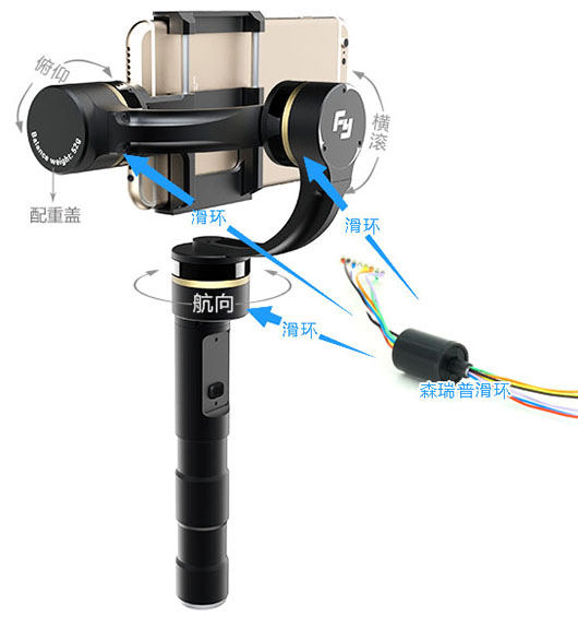 下面以該品牌某型號三軸云臺手機(jī)穩(wěn)定器(該手持云臺支持iPhone6 、小米4等手機(jī)攝影)為例介紹滑環(huán)的安裝。