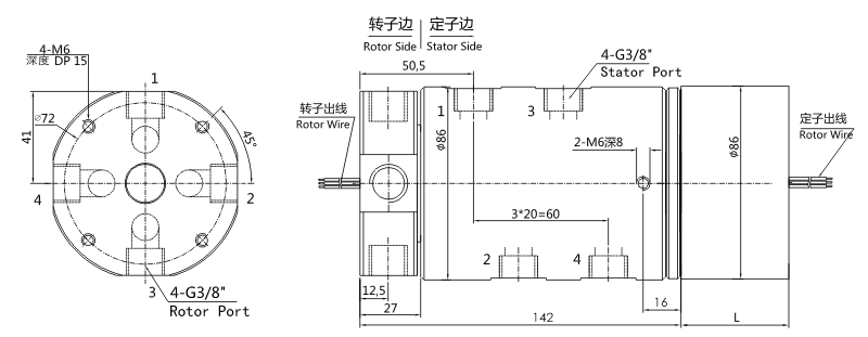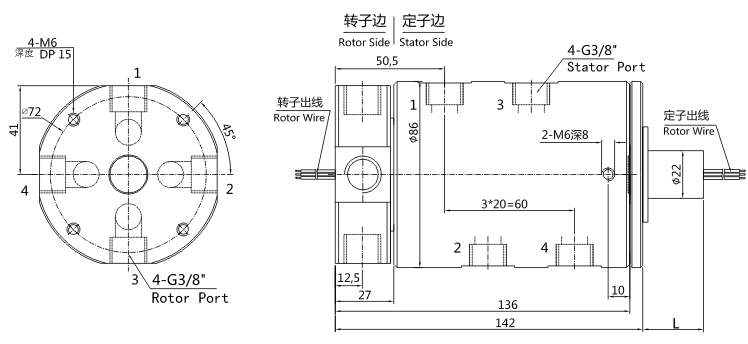 4進(jìn)4出,氣+電旋轉(zhuǎn)接頭,G3/8"接頭,10~12mm大小管徑