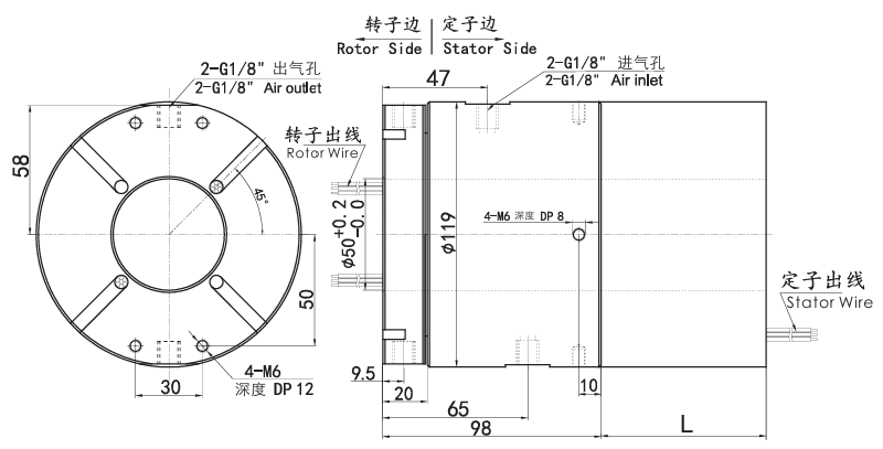 2通道(2進(jìn)2出)中空氣動(dòng)旋轉(zhuǎn)接頭,孔徑50mm,G1/8"牙,6∼8mm管。
